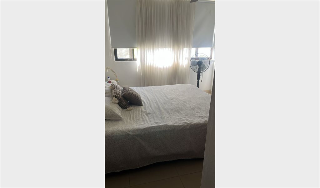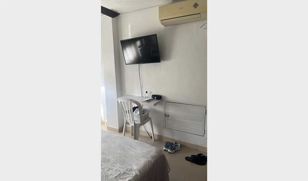 Linda habitación amoblada con cama doble, mesa de trabajo, closet amplio. Aire acondicionado y abanico de techo.