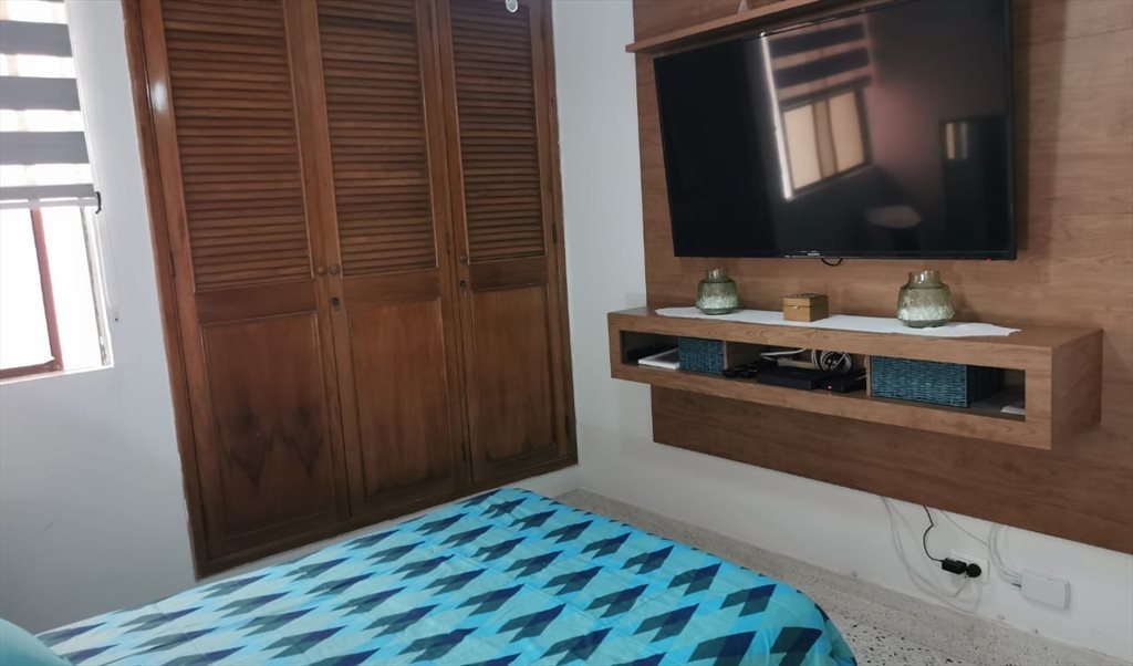 Habitación con cama doble, nochero, closet amplio, tv smart grande, abanico y aire acondicionado (opcional con costo adicional) y baño privado afuera de la habitación.