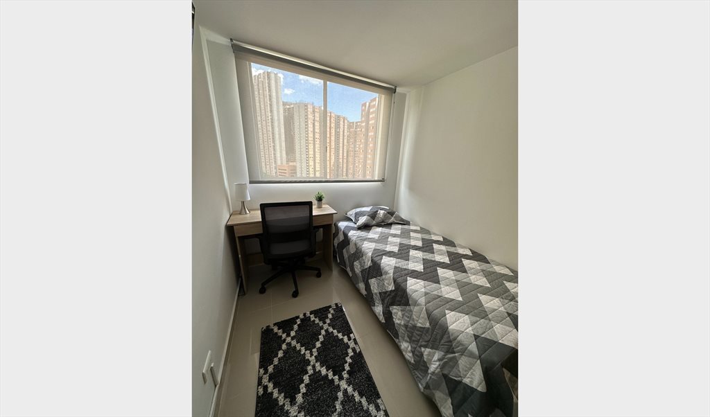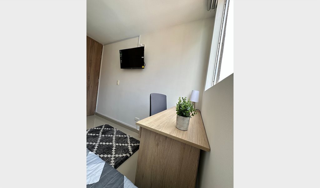 La habitación está completamente amoblada con cama, colchón, escritorio y silla ergonómica, closet y TV. Además, el precio incluye servicios públicos e internet.