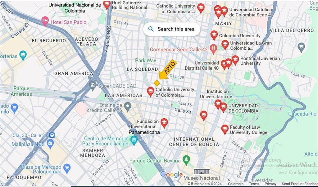 Apto de tres habitaciones disponibles de distintos precios (1'200.000, 1'100.000 y 1'000.000 COP). Desde el mes de junio 2025 estarán disponibles las tres habitaciones del apto. El precio de cada una incluye derecho a cocina, vajilla, enseres, baño, sala-comedor, lavadora, nevera internet (Wi-Fi), agua, luz, gas y administración del edificio. Edificio con portería seguridad 24 horas. Muy cerca a universidades principales (U Nacional, U Javeriana, U Distrital, U Santo Tomás, U Antonio Nariño, U Piloto, U Católica, Unimpahu entre otras), barrio La Soledad (Teusaquillo), muy tranquilo, seguro, excelente ubicación y transporte, a una cuadra de la avenida Park Way, acogedor, con chimenea. Convivencia bajo principios de respeto, colaboración y honestidad. No hay reglas tipo "familia", normas de convivencia y responsabilidad adulta básicas, aseo por cuenta de las 3 personas que vivan en el apto.