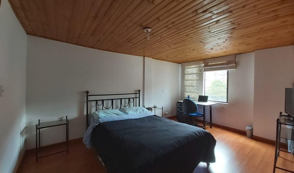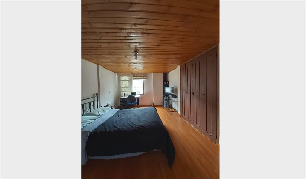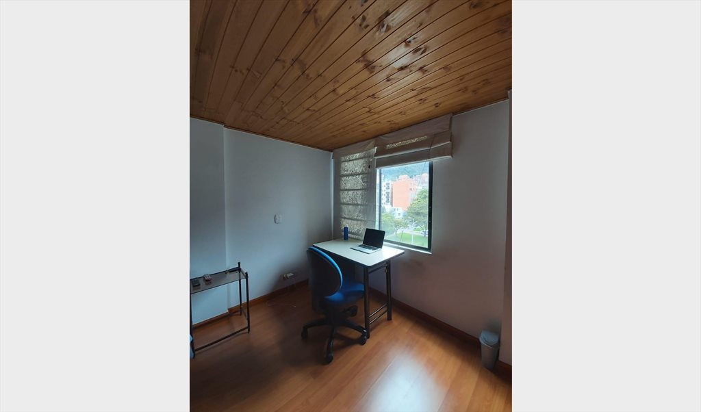 I'm renting one bedroom in Santa Barbara (North Zone). It has a double bed, 2 night stands, lamp, TV table, TV, desk, chair and closet with private bathroom inside the bedroom. The apartment has everything you need, kitchen, dining room, living room, laundry room , parking lot for additional $150.000 a month. It has a small balcony on the second floor. The monthly rent is COP $1,450,000 and it includes utilities, TV cable, internet, building maintenance fee, cleaning and laundry services once a week plus cleaning supplies.