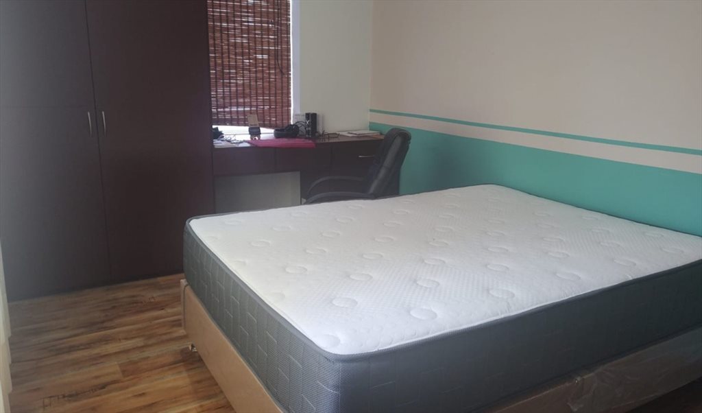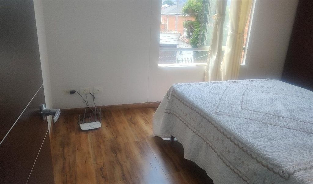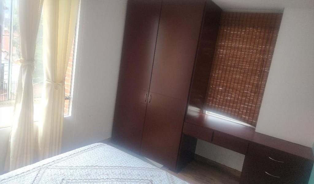 Habitación con cama, escritorio, closet, dos ventanas, esquinera. Baño en el pasillo.