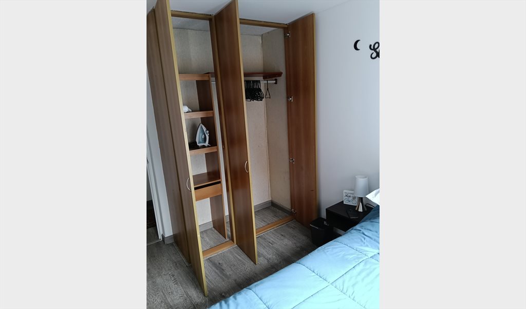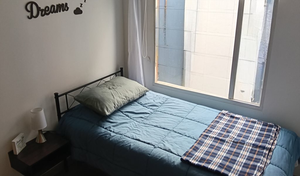 Se arrienda habitación amoblada: cama sencilla, closet, mesita de noche y lámpara.