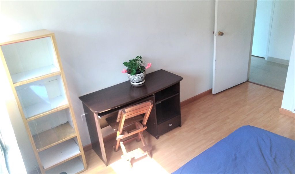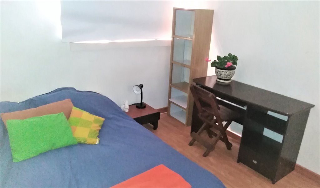 Está amoblada: cama doble, ropa de cama, cortinas, escritorio, closet amplio, mesa de noche. Con excelente ventilación y luz. Baño con agua caliente (compartido con dos personas)