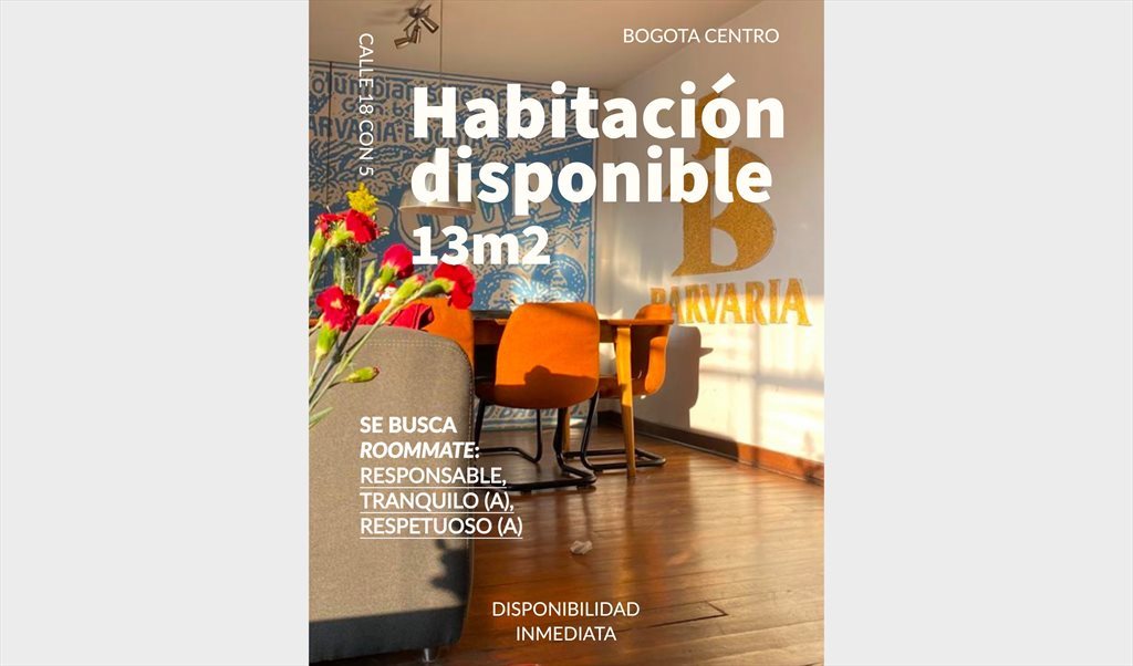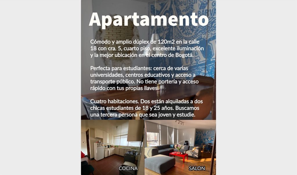 Cómodo y amplio apartamento dúplex de 120m2 en la calle 18 con cra. 5, cuarto piso, excelente iluminación y la mejor ubicación en el centro de Bogotá.