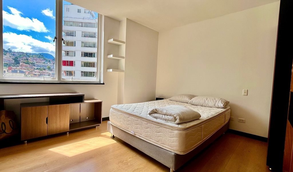 El apartamento cuenta con dos habitaciones, cada una con baño privado y un baño social adicional. Una cocina tipo isla y amplios espacios. Se destaca por su vista privilegiada al Parque de los Periodistas, Monserrate y los Cerros Orientales, un verdadero privilegio en pleno centro de la ciudad.