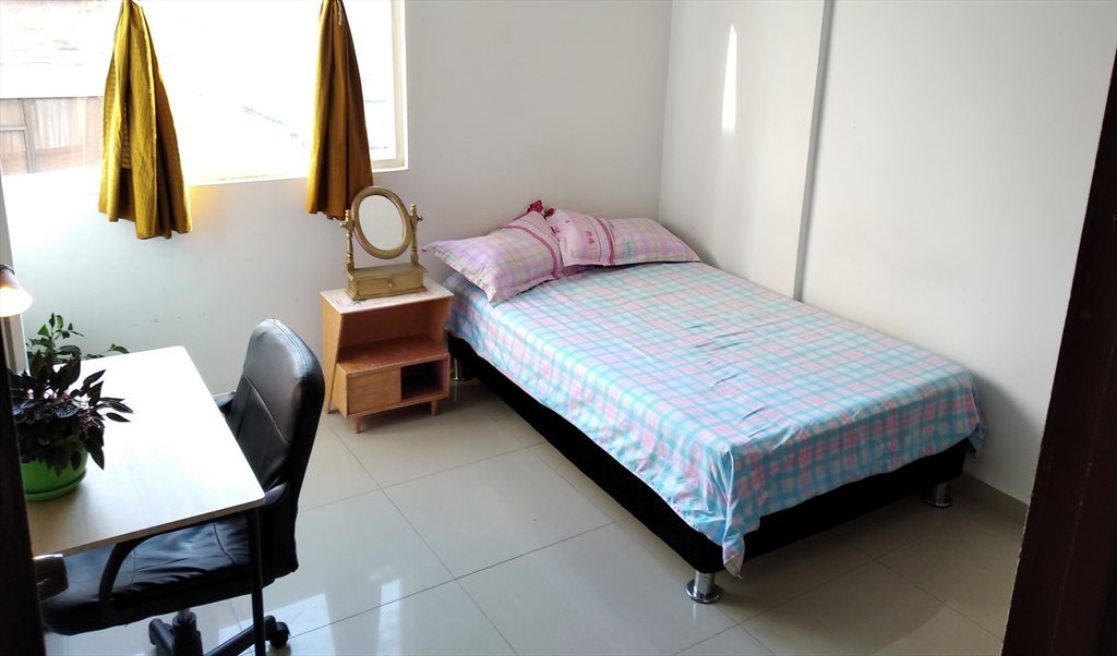 Está amoblada: cama doble, ropa de cama, escritorio grande, closet amplio, mesa de noche, baño con agua caliente (se comparten con dos personas). Con excelente ventilación y luz.