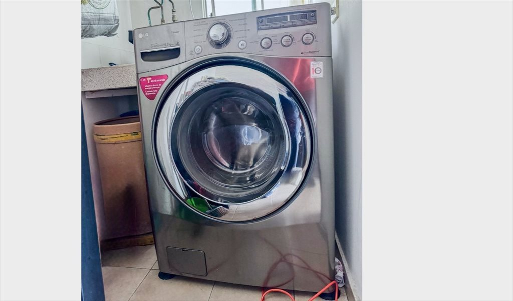 Zona de ropas con lavadora de carga frontal, lavadero y calentador a gas