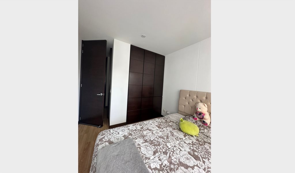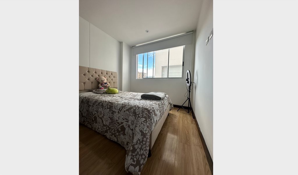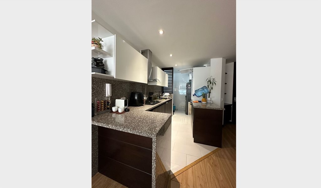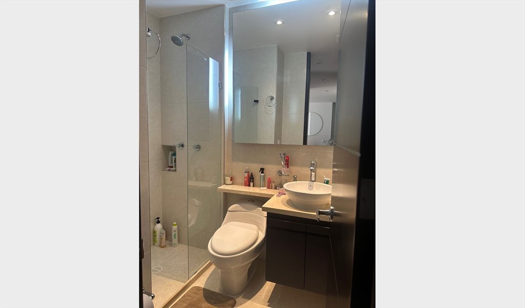 El apartamento tiene 82 m² y cuenta con sala, comedor, cocina estilo americana, un pequeño balcón y 2 baños. La habitación en arriendo comparten el baño social.