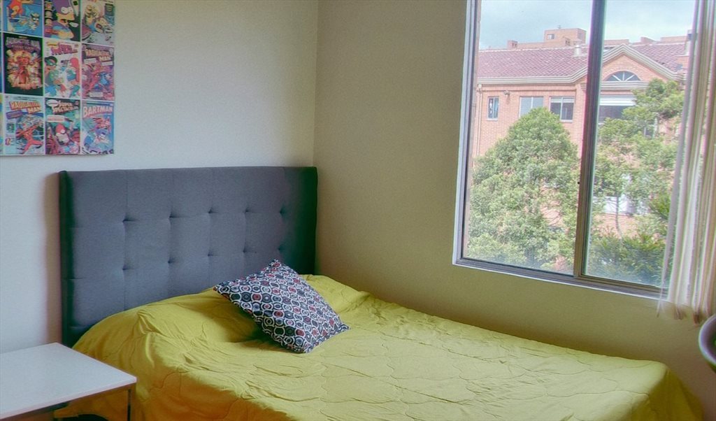 Habitación amoblada con cama doble, con muchos parques y zonas verdes al rededor; vas a compartir con un perro y dos gatos, hermosos animales. Cuenta con chimenea interior y acceso al gimnasio. Cerca a la biblioteca Julio Mario y Centros comerciales.