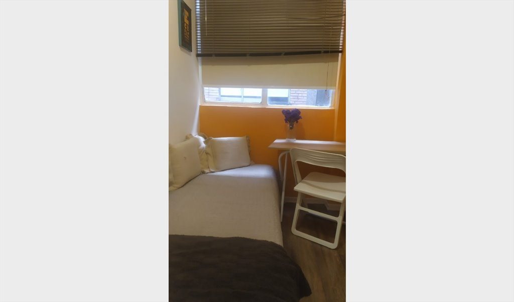 TU HABITACIÓN: habitación de espacio justo, sin embargo comoda, acogedora y privada, bien iluminada y ventilada, amoblada con cama sencilla escritorio, closet, Tiene una ventana grande! con blackout y persiana, baño de uso privado, ducha con agua caliente.