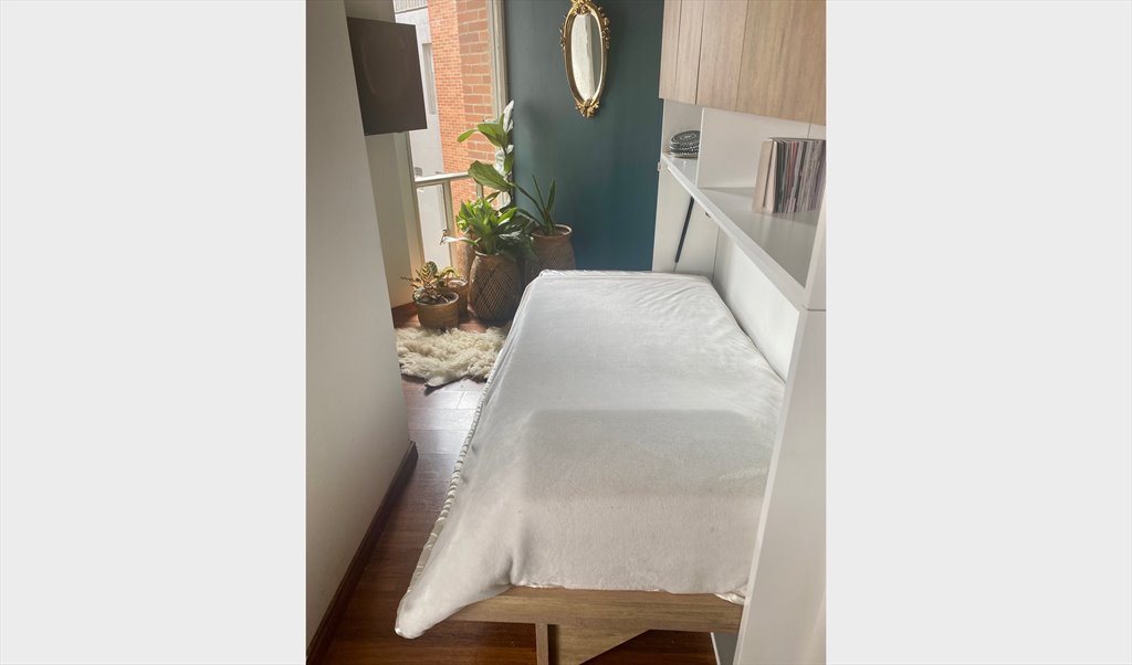 Habitación Amoblada con baño privado y cama sencilla abatible de colchón ortopédico, Luz y ventilación natural.