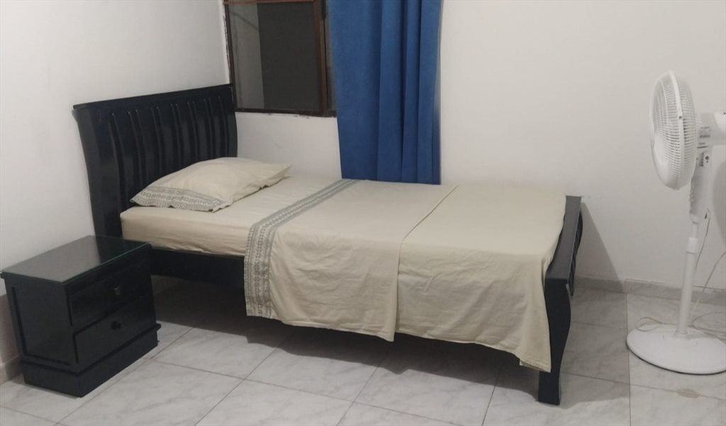 Habitacion con cama semidoble, mesita de noche y ventilador. Closet amplio. Apartamento bien ubicado, cerca de la bahía y supermercados.