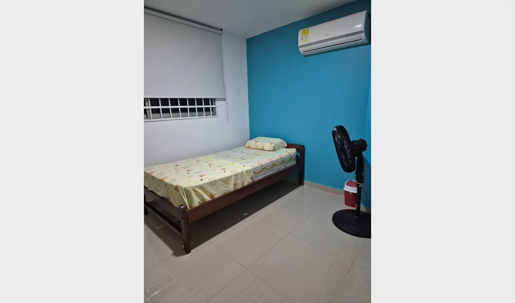 Habitación individual con closet amplio, aire acondicionado, abanico y cama, acceso compartido a zonas comunes.