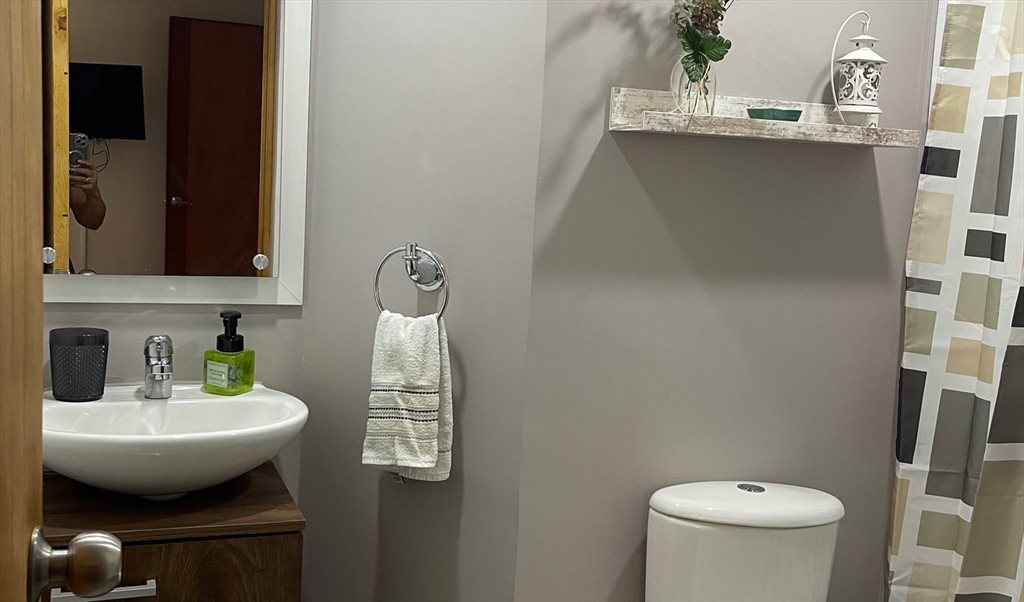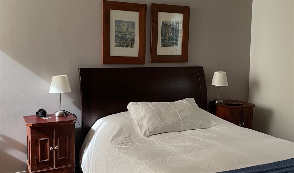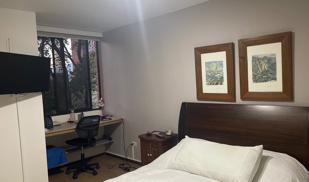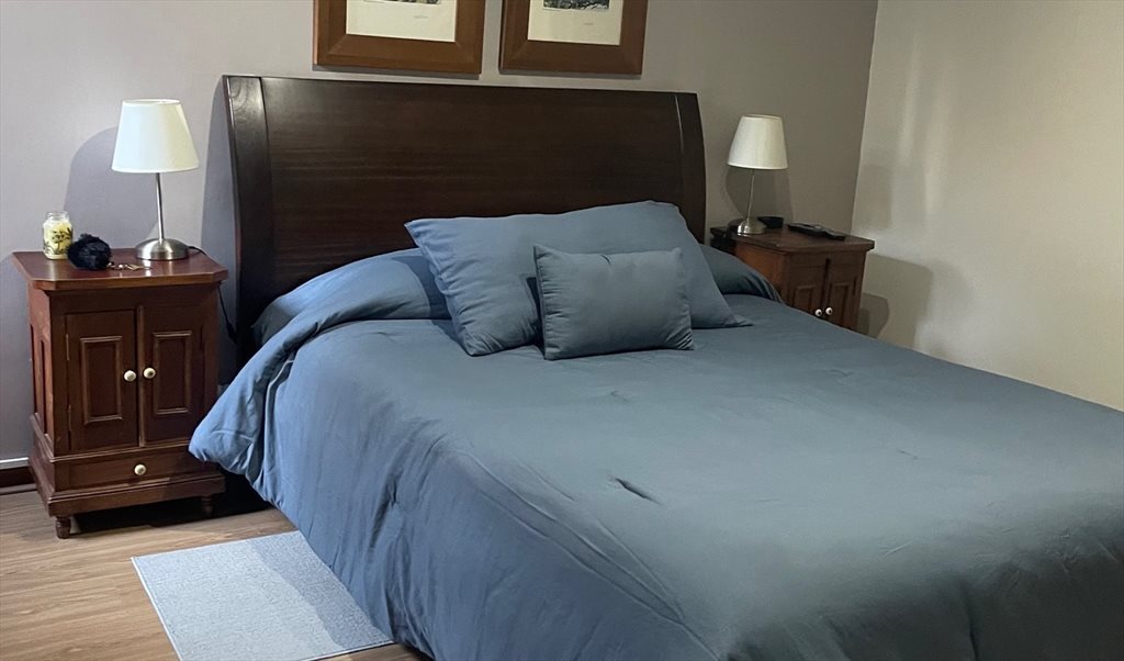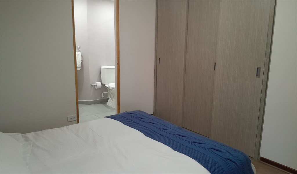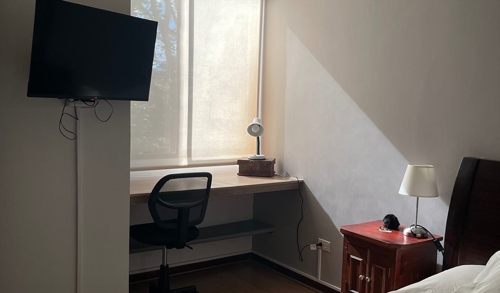 Tiene cama doble, nocheros, TV, clóset, escritoro