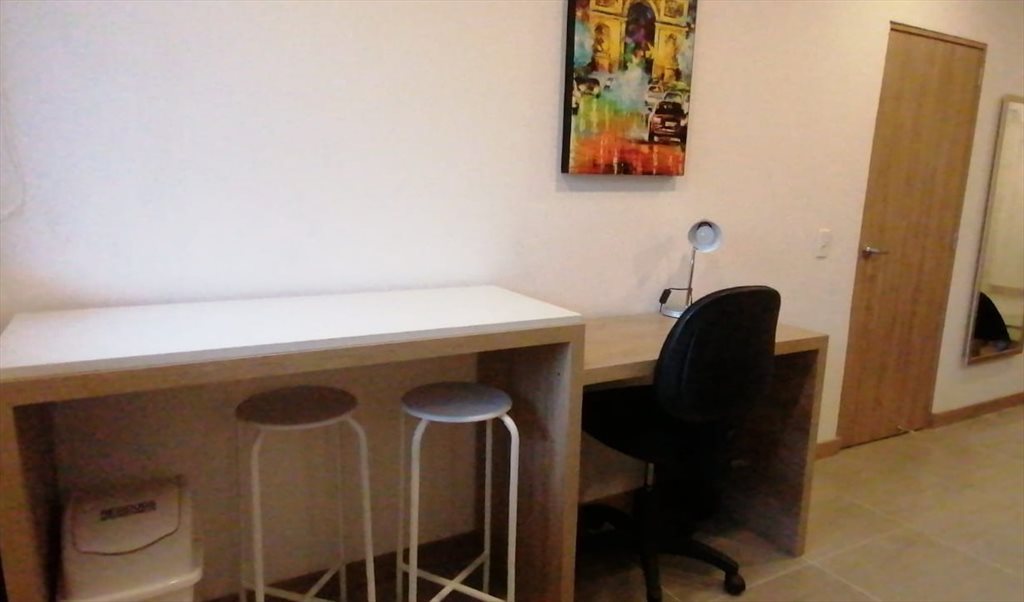 Zona de ropas: Funcional con lavadora.Zona de estar: Con sofá y área de trabajo equipada con escritorio y silla.Cocina: Equipada con estufa, nevera, microondas y barra tipo americano.