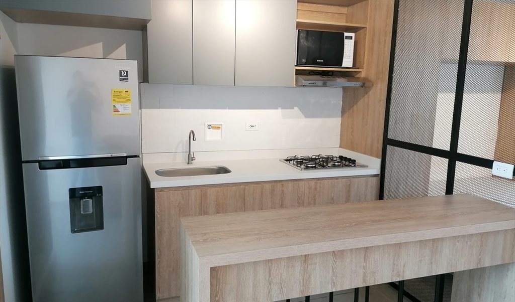 Hermoso apartaestudio en arriendo. Recién remodelado y con un estilo arquitectonico moderno. A pocas cuadras del estadio, muy cerca de la avenida 70. con excelentes rutas de acceso y transporte publico. Es muy iluminado y ventilado. Mide 30 mtrs cuadrados. Tiene cocina integral totalmente equipada con barra tipo americano, baño, alcoba con closet y escritorio, sofá cama, y un pequeño balcón, el inmueble es muy ventilado e iluminado. Esta nuevo, se alquila totalmente amoblado con servicios publicos incluidos