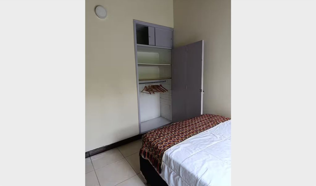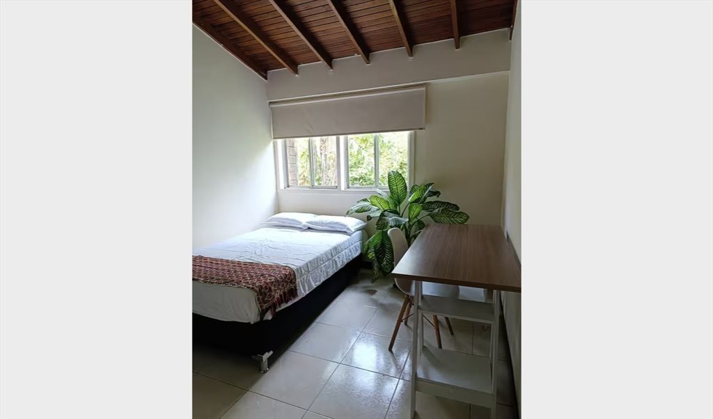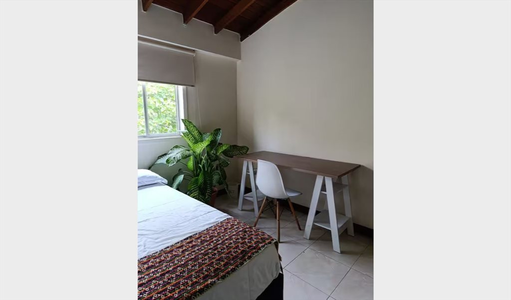 Habitación amoblada con cama semidoble, ropa de cama, escritorio y silla. Cuenta con closet y la vista es a una zona verde muy bonita (no hay vecinos hacia ese lado de la casa). El baño es contiguo a la habitación, y se comparte con 1 persona.