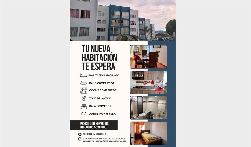 📍Ubicación: Cr 16 #67-59 Bloques de Villa Alicia, Bloque 8 - 501. Frente a la Estación de Megabús El Viajero 🧳