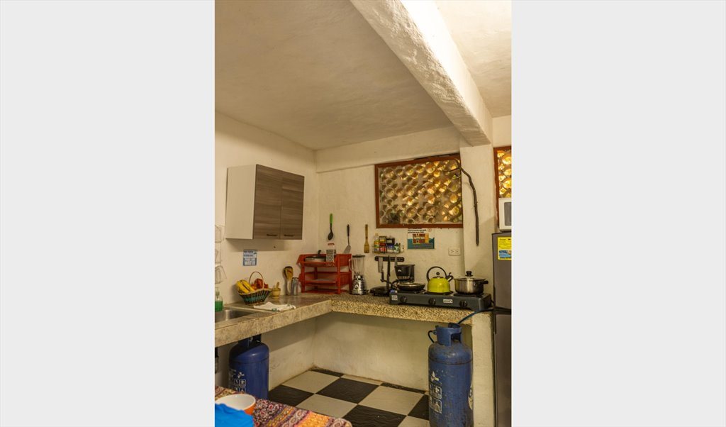 Hay una cocina compartida y bien equipada con nevera y microondas, electrodomésticos y utensilios básicos de cocina. La terraza está amoblada con una mesa larga de comedor, mesas redondas individuales, un parasol y varias sillas altas ideales para disfrutar la vista al mar y la bahía de Taganga.