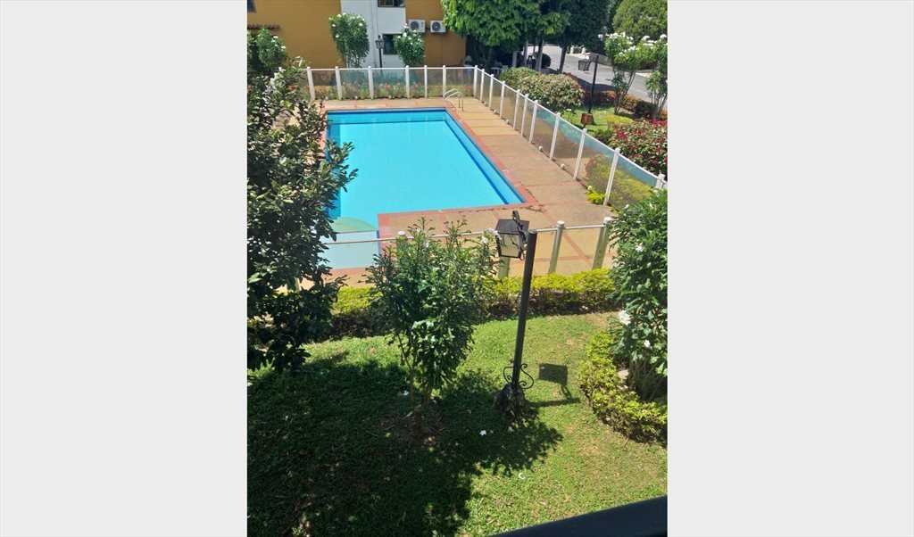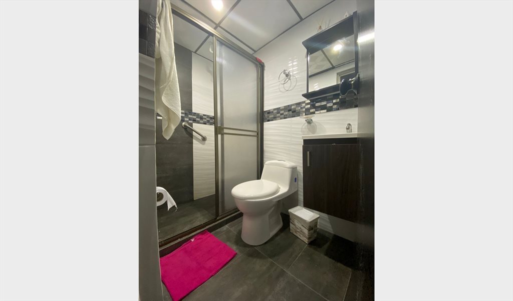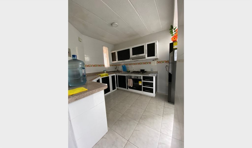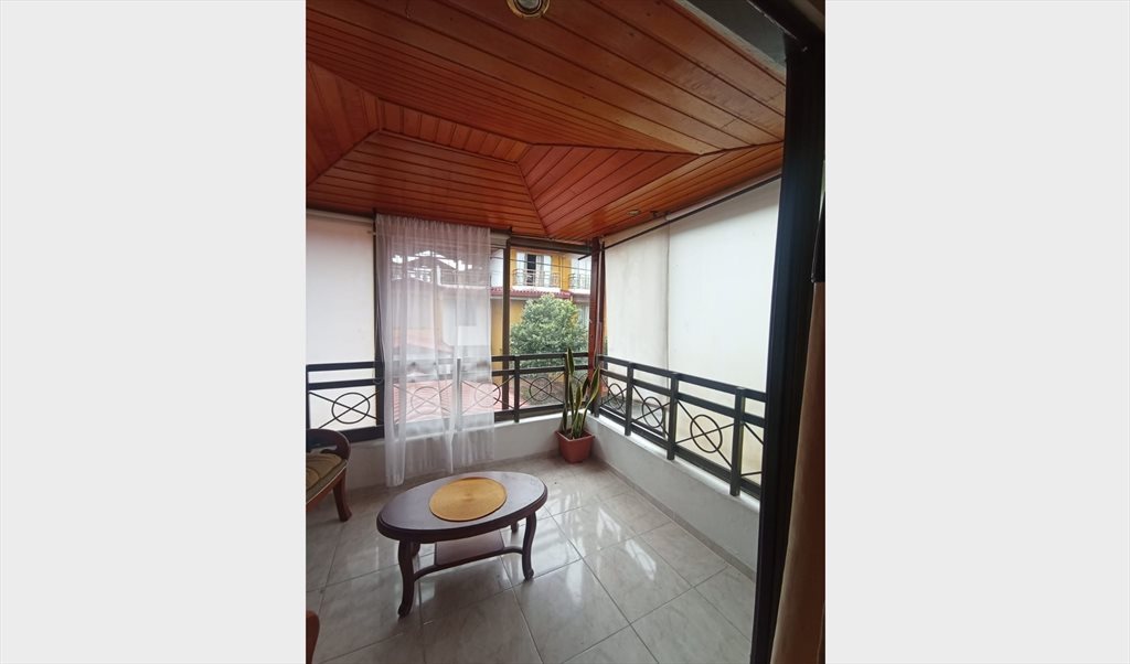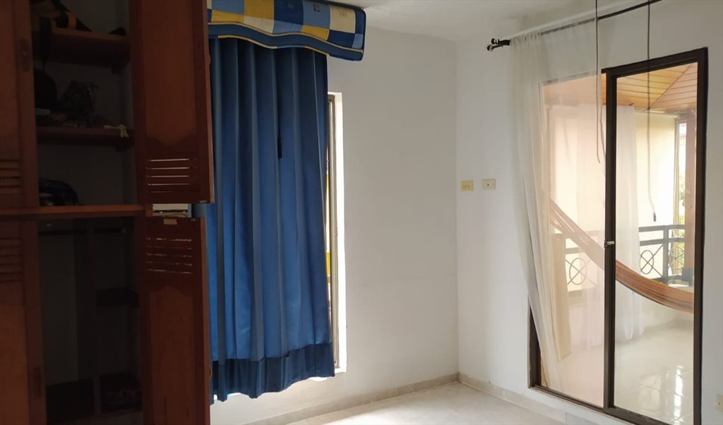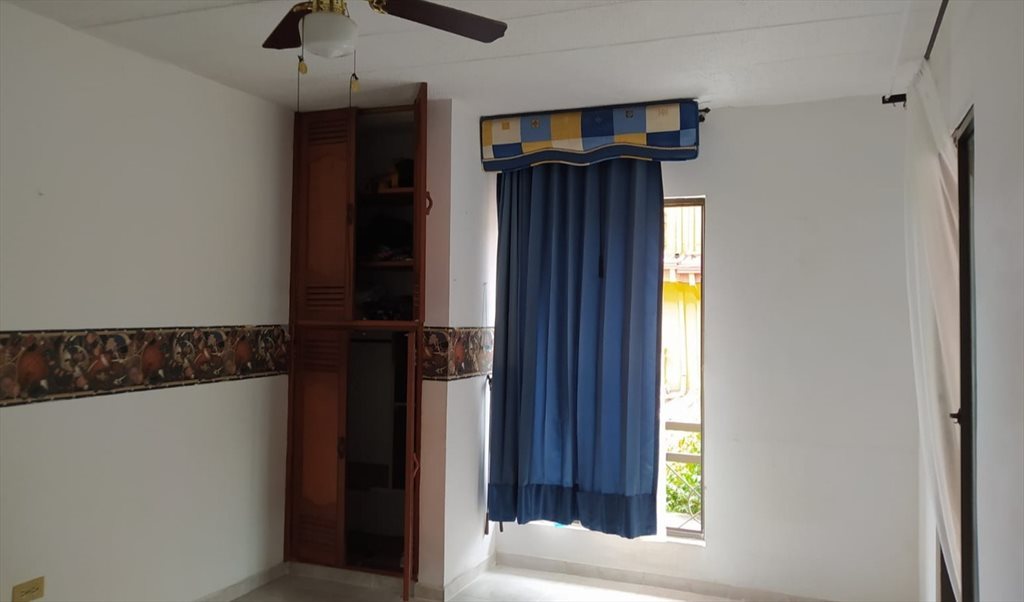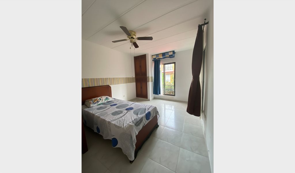 Habitación amoblada para mujer, incluye cama sencilla, closet, ventilador, balcón y acceso a zonas comunes como cocina, lavadero, parqueadero y piscina.